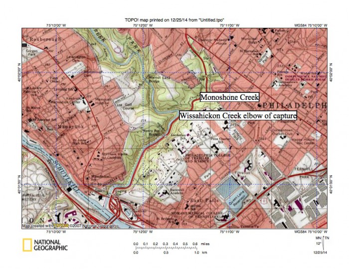Figure 15: Wissahickon Creek elbow of capture at Monoshone Creek and the Wissahickon Creek confluence with the Schuylkill River. United States Geological Survey map presented using National Geographic TOPO software.