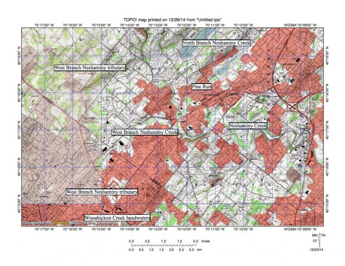 Figure 1: Wissahickon Creek flows from its headwaters to the map southwest corner. A West Branch Neshaminy Creek tributary flows in a northeast direction across the northwest corner of the map. Little Neshaminy Creek headwaters are near the map south center edge and flow in a northeast and east direction to the map east edge (slightly south of center). United States Geological Survey map presented using National Geographic TOPO software.