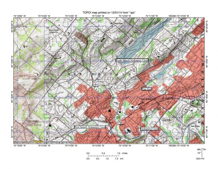 Figure 4: Elbows of capture where southwest oriented North Branch Neshaminy Creek and Pine Run turn to join the northeast oriented West Branch Neshaminy Creek and to form east oriented Neshaminy Creek, which east of figure 3 turns to flow in a south-southeast direction to join a southwest oriented Delaware River segment. United States Geological Survey map presented using National Geographic TOPO software.