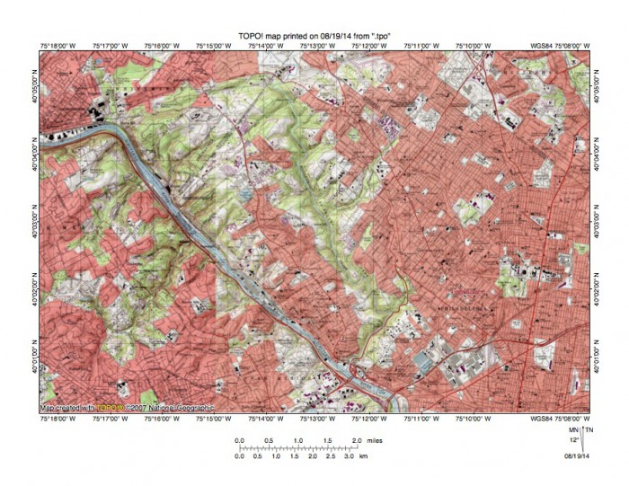Figure 11: Reduced size topographic map showing the northwest Philadelphia area where the Schuylkill River and Wissahickon Creek have cut gorges across the 400-foot high complex of metamorphic and igneous rock. The Schuylkill River flows in a southeast direction and the south oriented Wissahickon Creek gorge is located near the map center. Note how tributary valleys are oriented in southwest and northeast directions on both sides of both the Wiisahickon and the Schuylkill valleys. This northeast to southwest tributary orientation is evidence large volumes of southwest oriented water flowed across the region as both the Wissahickon Creek gorge and the Schuylkill River gorge were being eroded. Wissahickon Creek valley headward erosion beheaded southwest oriented flow routes to the actively eroding Schuylkill River valley. United States Geological Survey map presented using National Geographic TOPO software