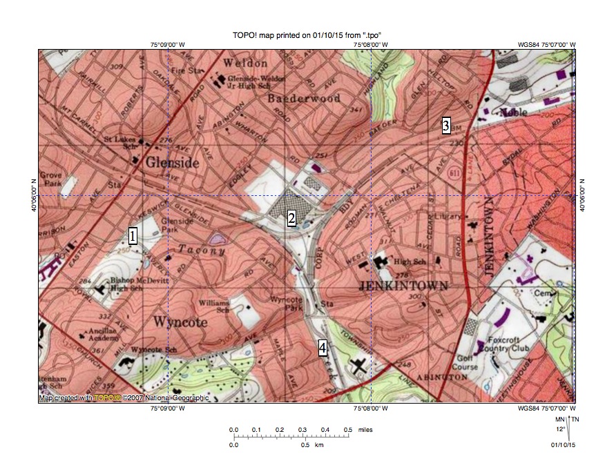 Figure 1: Jenkintown elbow of capture. Location 1 shows Tacony Creek flowing in an east direction through Glenside to its Jenkintown Elbow of Capture (location 2) where it is joined by the southwest oriented Meadow Brook Through Valley (location 3) and turns to flow in a south-southeast direction to and beyond location 4. United States Geological Survey map digitally presented using National Geographic TOPO software.