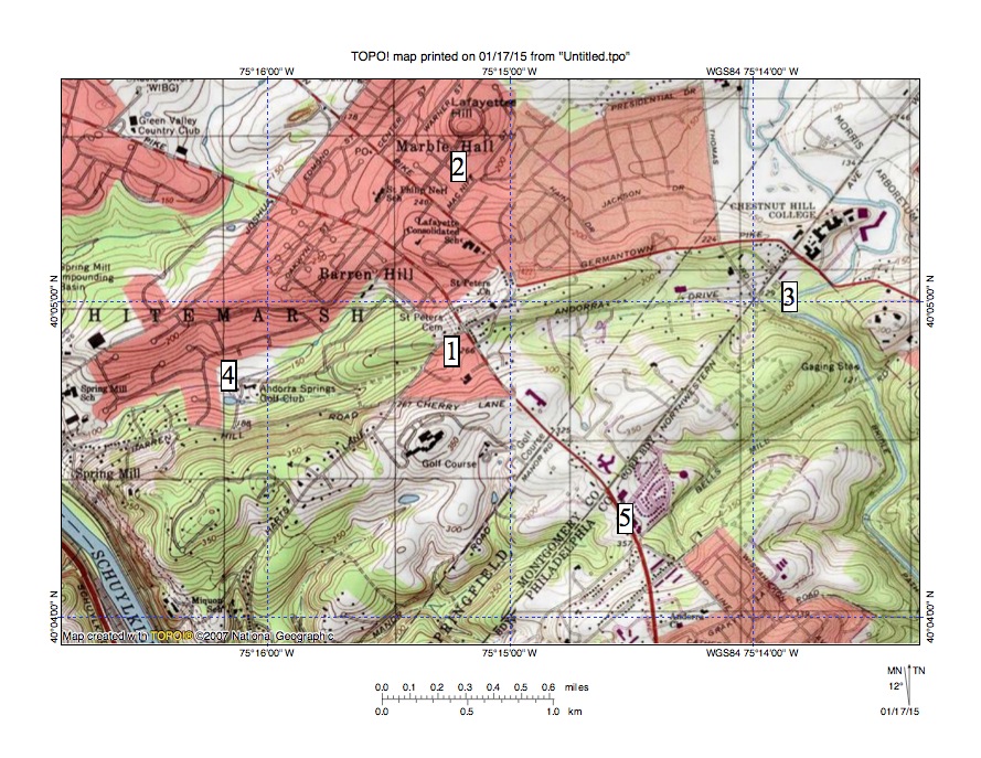 Figure 1: The Andorra Wind Gap is found at location 1. The east-northeast valley beginning at the Andorra Wind Gap drains to the Wissahickon Gorge north entrance at location 3. The west-southwest oriented valley draining to location 4 joins the Schuylkill just west of the map at Spring Mill. Spring Mill Creek can be seen flowing in southwest and south directions in the map northwest corner. The Marble Hall Through Valley at location 2 links the Spring Mill Creek valley with the south oriented Wissahickon Creek valley. United States Geological Survey map digitally presented using National Geographic TOPO software.