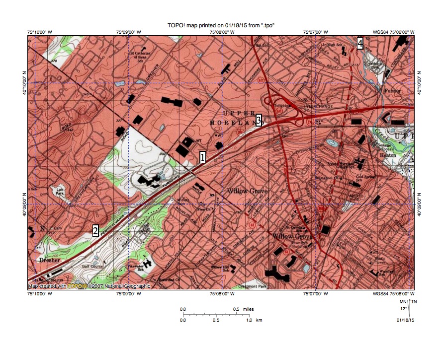 Figure 1: The Pennypack Creek-Wissahickon Creek drainage divide at location 1 crosses the Dresher-Pennypack Through Valley. A southwest oriented Wissahickon Creek tributary at location 2 drains the through valley southwest end while a northeast oriented Pennypack Creek tributary drains the through valley northeast end. Pennypack Creek flows in a south direction from location to Fulmor and Heaton before turning to flow to the map east edge. United States Geological Survey map digitally presented using National Geographic TOPO software.