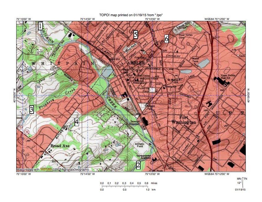 Figure 1: Wissahickon Creek in the Ambler region. See text for discussion. United States Geological Survey map digitally presented using National Geographic TOPO software.