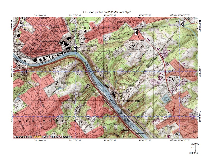 Figure 1: Spring Mill Elbow of Capture is found at location 2, the Andorra Wind Gap at location 4, and the Wissahickon Gorge north entrance at location 6. The southeast oriented Schuylkill River segment downstream from location 2 is in the Schuylkill Gorge. Note southwest oriented Schuylkill River tributaries from the northeast and northeast oriented and barbed tributaries from the southwest. United States Geological Survey map digitally presented using National Geographic TOPO software.