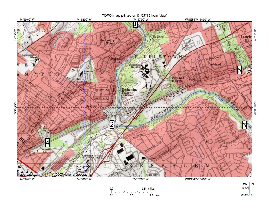 Figure 1: Neshaminy Creek flows from location 1 to location 2 and then to location 3. United States Geological Survey map digitally presented using National Geographic TOPO software.