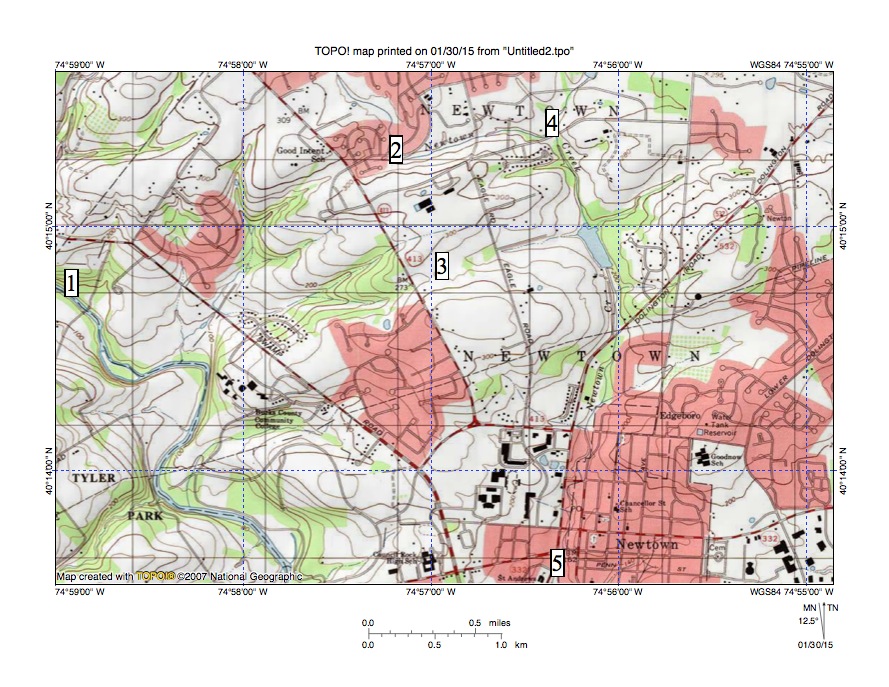 Figure 1: Neshaminy Creek flows in a southeast direction from location 1. Newtown Creek flows in a south direction to location 2 and then an east-northeast direction to location 4 and next in a south direction to location 5 and finally joins Neshaminy Creek south of figure 1. Shallow through valleys at locations 2 and 3 link the Newtown Creek valley with the Neshaminy Creek valley. Note northeast oriented stream in map southwest corner joining Neshaminy Creek as a barbed tributary. United States Geological Survey map digitally presented using National Geographic TOPO software.
