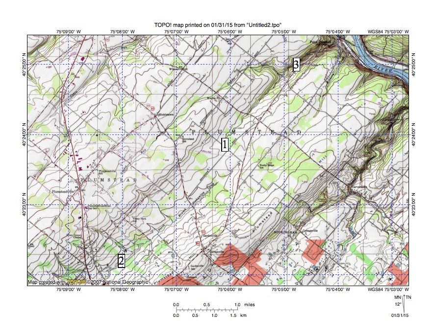 Figure 1: The Delaware River-North Branch Neshaminy Creek Plumstead Township Through Valley drainage divide is found at location 1. The North Branch Neshaminy Creek flows in a southwest direction at location 2 and Geddes Creek flows in a northeast direction at location 3 and joins the Delaware River as a barbed tributary. The map predates Bradshaw Reservoir, which now floods part of the Geddes Creek drainage basin. United State Geological Survey map digitally presented using National Geographic TOPO software.