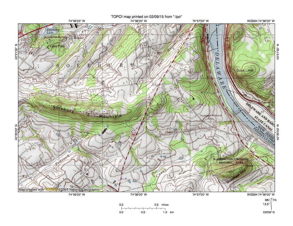 Figure 1: Solebury Mountain in Bucks County, PA. The Delaware River flows in a south and southeast direction in a water gap eroded between Solebury Mountain and Goat Hill. United States Geological Survey topographic map digitally presented using National Geographic TOPO software.