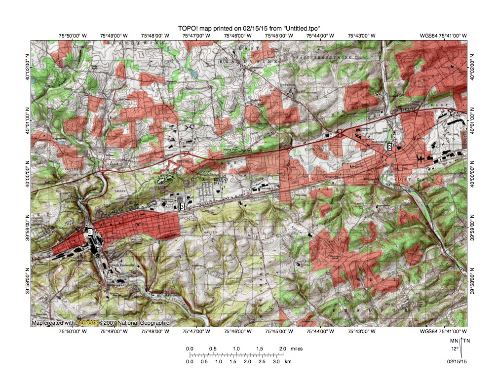 Figure 1: Chester Valley segment between Coatesville and Downtown. West Branch Brandywine Creek flows across the Chester Valley at location 1 and East Branch Brandywine Creek flows across the Chester Valley at location 2. The West Branch-East Branch drainage divide is near location 3. United States Geological Survey map digitally presented using National Geographic TOPO software.