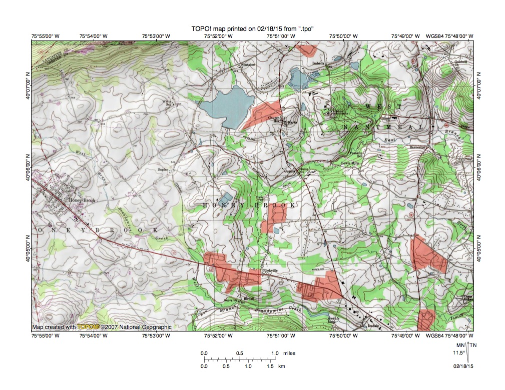 Figure 1: Drainage divide area between the East Branch Brandywine Creek and the West Branch Brandywine Creek in the Honey Brook basin between Welsh Mountain (near northwest corner) and the Baron Hills (along south center edge). United States Geologic Survey map digitally presented using National Geographic TOPO software.