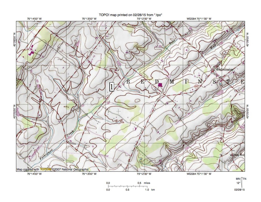 Figure 1: The through valley linking southwest oriented East Branch Perkiomen Creek with northeast oriented Deer Run at location number 1 crosses the drainage divide between the Delaware River and the Schuylkill River. United States Geological Survey map digitally presented using National Geographic TOPO software.