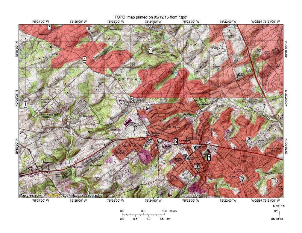 Figure 1 illustrates the Crum Creek-Darby Creek drainage divide area located near Newtown Square. Newtown Square is the urban area located slightly south of the figure 1 center, Darby Creek is the southeast oriented stream flowing through location 2 and Crum Creek is the southeast and south-southeast oriented stream flowing through location 1. Locations 3, 4, 5, 6, and 7 identify saddles or notches found along the Crum Creek-Darby Creek drainage divide. Note how each of those saddles or notches links the valley of a northeast oriented tributary flowing to southeast oriented Darby Creek with the valley of a southwest oriented tributary flowing to southeast and south-southeast oriented Crum Creek. The northeast oriented Darby Creek tributaries can be classified as barbed tributaries in that they flow in a north direction to join a south oriented stream. Also note how Darby Creek tributaries from the northeast flow in southwest directions.