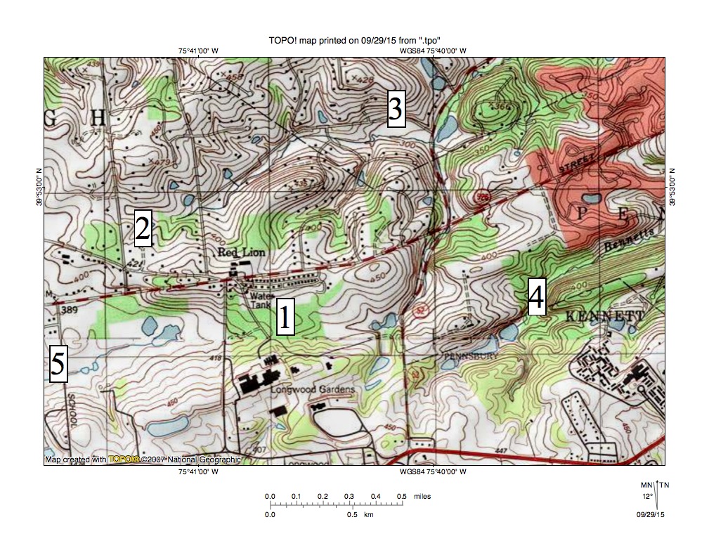 Figure 1 provides a regional map of the Longwood Gardens area and figure 2 provides an enlargement of the Longwood Gardens area from the figure 1 map. Location 1 is the former east-to-west oriented water flow channel on the Longwood Gardens grounds. Brandywine Creek can be seen flowing in a south-southeast direction across the northeast corner of figure 1 and the East Branch Red Clay Creek flows in a south direction near the southwest corner of figure 1. Just east of location 1 is a north-northeast oriented stream that flows to northeast and southeast oriented Pocopson Creek, which then joins Brandywine Creek. Location 4 identifies east-northeast oriented Bennetts Run, which flows to Brandywine Creek as a barbed tributary. Note how the north-northeast oriented stream and Bennetts Run both originate in the same area near the east end of the Longwood Gardens property and then diverge to flow in different directions only to end up near each other again in the Brandywine Creek valley. Location 5 identifies a west-southwest tributary to the south oriented East Branch Red Clay Creek. Locations 2 and 3 identify the ends of another former water flow channel located north of Red Lion.