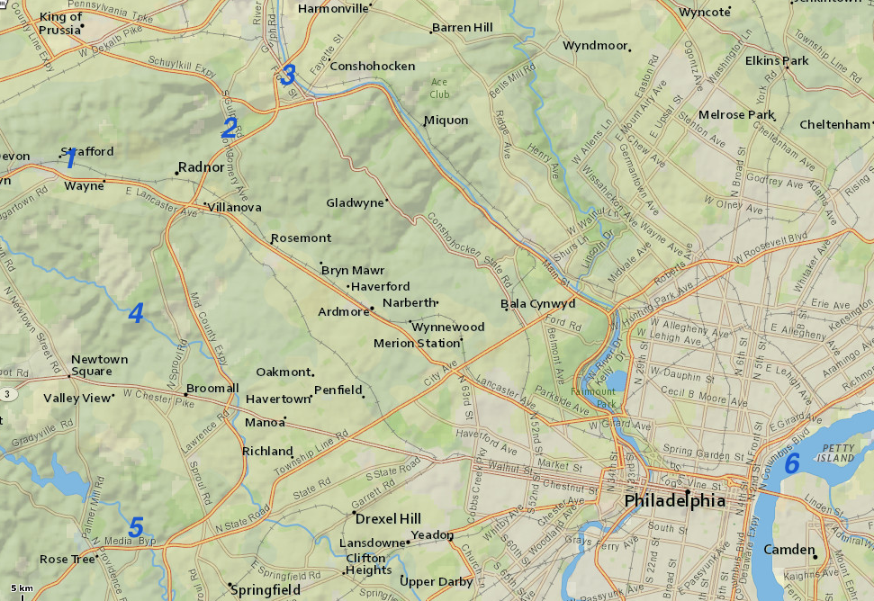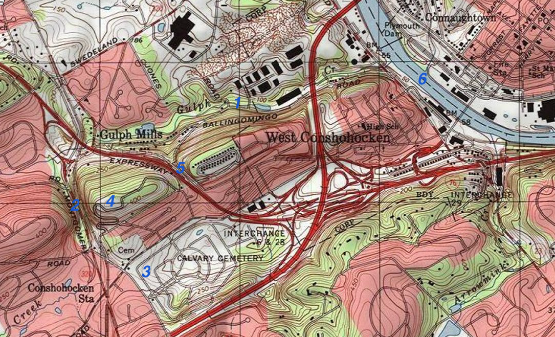 Figure 5: Map illustrates the Gulph Creek east-northeast channel location downstream from the Gulph Creek water gap (location 1), the Gulph Creek water gap (location 2), the Matsonford through valley (location 3), the erosion resistant metamorphic bedrock ridge between the Matsonford through valley and the downstream Gulph Creek east-northeast channel known as Rebel Hill (location 4), the wind gap in that high ridge now used by the Schuylkill Expressway (location 5), and the southeast oriented Schuylkill River valley alignment upstream from its east-northeast jog (location 6). Note, Conshohocken Station on the Norristown high Speed Line in the map southwest corner has been renamed as the Matsonford Station. Click on map to enlarge.