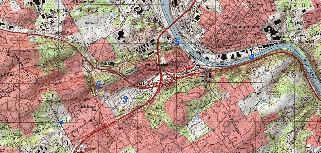 Figure 4: Topographic map illustrating the east-northeast oriented Gulph Creek valley upstream from the “Gulph” or the Gulph Creek water gap (location 1), the “Gulph” or the Gulph Creek water gap (location 2), the Matsonford through valley (location 3), the east-northeast jog in the otherwise southeast oriented Schuylkill River (location 4), and the Gulph Creek mouth (location 5). Click on map to enlarge.
