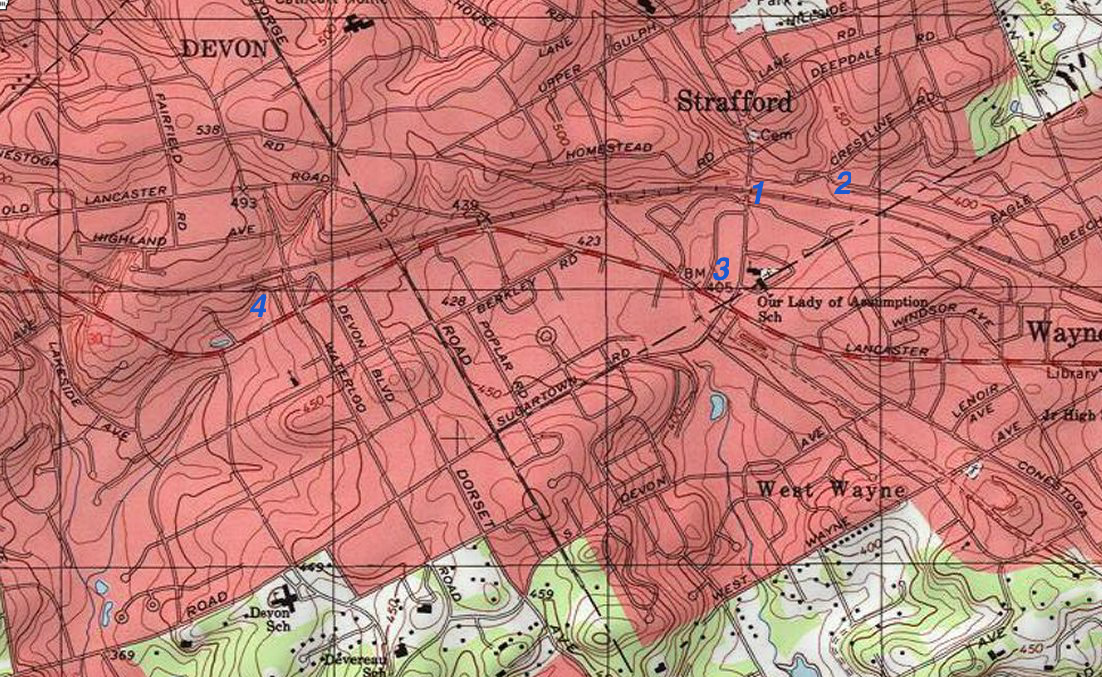 Figure 3: Topographic map illustrating the Strafford through valley area. The contour interval is 10 feet and the map shows an area about 2.5 miles wide. The Strafford railroad station (location 1) is in the through valley and is on the Gulph-Darby Creek drainage divide. Gulph Creek headwaters are at location 2, Little Darby Creek headwaters at location 3, and another Darby Creek tributary headwaters at location 4. Click on map to enlarge.